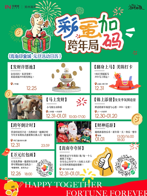 12月31日-1月3日,憑快樂幣可免費騎小馬、抽獎、兌換零食禮包,輕松實現童趣與味蕾雙重滿足??缒暌?,商場營業(yè)時間延長至23:00后自然閉店,大屏同步跨年倒計時,和親友一起在歡呼聲中迎接2026,氛圍感直接拉滿!